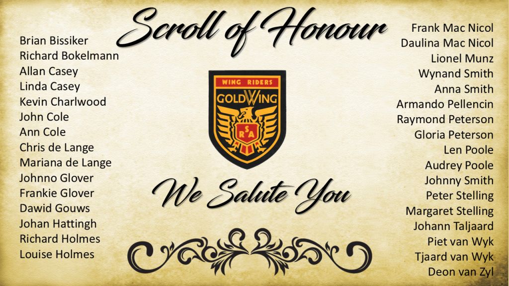An active member with uninterrupted membership of 25 years, automatically becomes an honorary member retaining his/her voting right. The membership fee of such honorary members who wish to exercise their voting rights, is 50% of the annual membership fee. Honorary members are required to attend at least two official runs – excluding the Wing Fling – of any current chapter of the Wing Riders of SA in order to retain his/her voting right. Any person – whether a past active member of the Association or not – whom the Association wishes to honour, may be elected as an honorary member for life. These honorary members have no voting rights and are not liable to pay any membership fees.