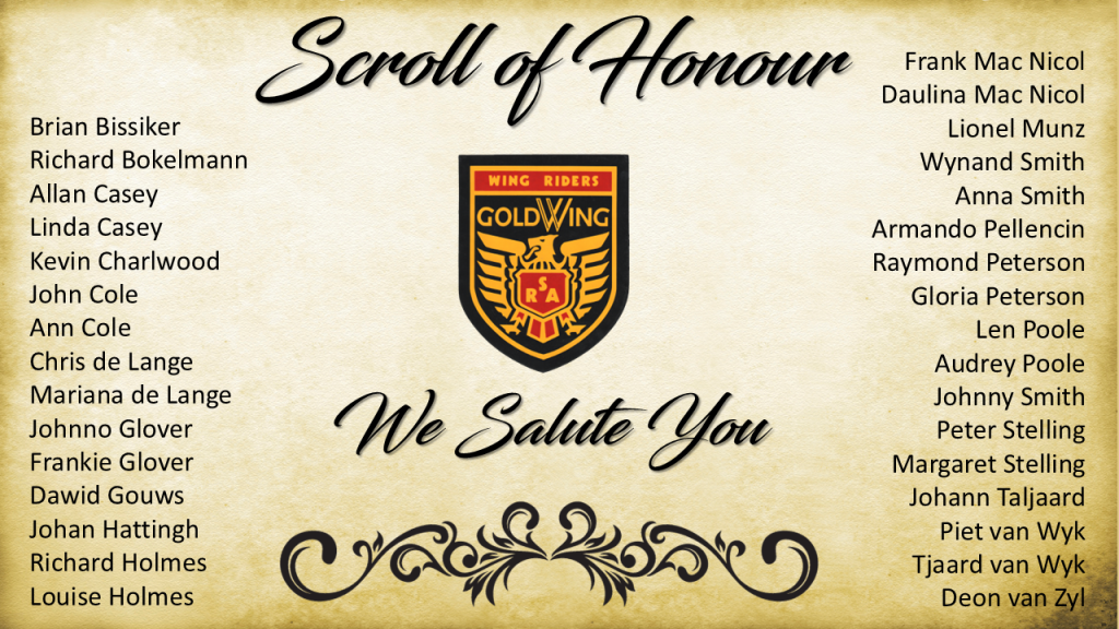 An active member with uninterrupted membership of 25 years automatically becomes an honorary member, retaining their voting rights. The membership fee for such honorary members who wish to exercise their voting rights, is 50% of the annual membership fee. Honorary members are required to attend at least two official runs – excluding the Wing Fling – of any current chapter of the Wing Riders of SA in order to retain his/her voting right. Any person – whether a past active member of the Association or not – whom the Association wishes to honour, may be elected as an honorary member for life. These honorary members have no voting rights and are not liable to pay any membership fees.